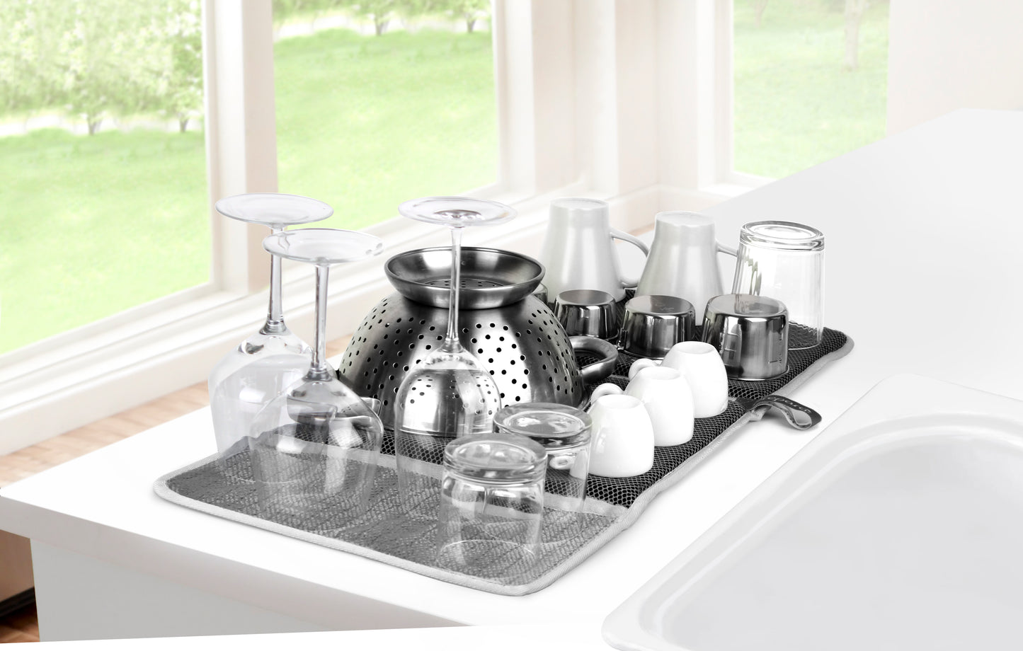 The DryDock Deluxe is a high-performance dish mat featuring a honeycomb structure that ensures maximum airflow for fast drying. Made from eco-friendly, antibacterial-treated material, it absorbs up to 5x more moisture than regular towels, keeping your kitchen fresh and odor-free. Plus, it's machine washable for easy cleaning and folds for convenient storage.